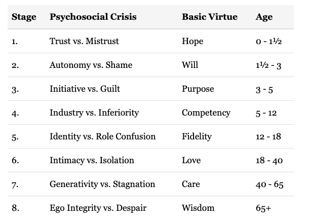 After many decades, the psychosocial stages (he named them “crises) of Erik Erikson still have value. I have posted them below. Please read about them at https://www.simplypsychology.org/Erik-Erikson.html
